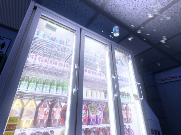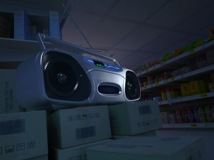 “After Hours” focuses on creative story development, stylized character animation, dramatic cinematic lighting and clean, sophisticated rendering. The concept was to show a closed convenience store in which a radio was left playing in the background. As we cut to the inside of the refrigerator, we think the (talking) products are agitated by this only to find out they are actually annoyed by the cans partying above them. We then cut to the top level where the Diet Pepsis are rocking out to The Ramones. To find out what happens next, you’ll have to download the movie below the following images.