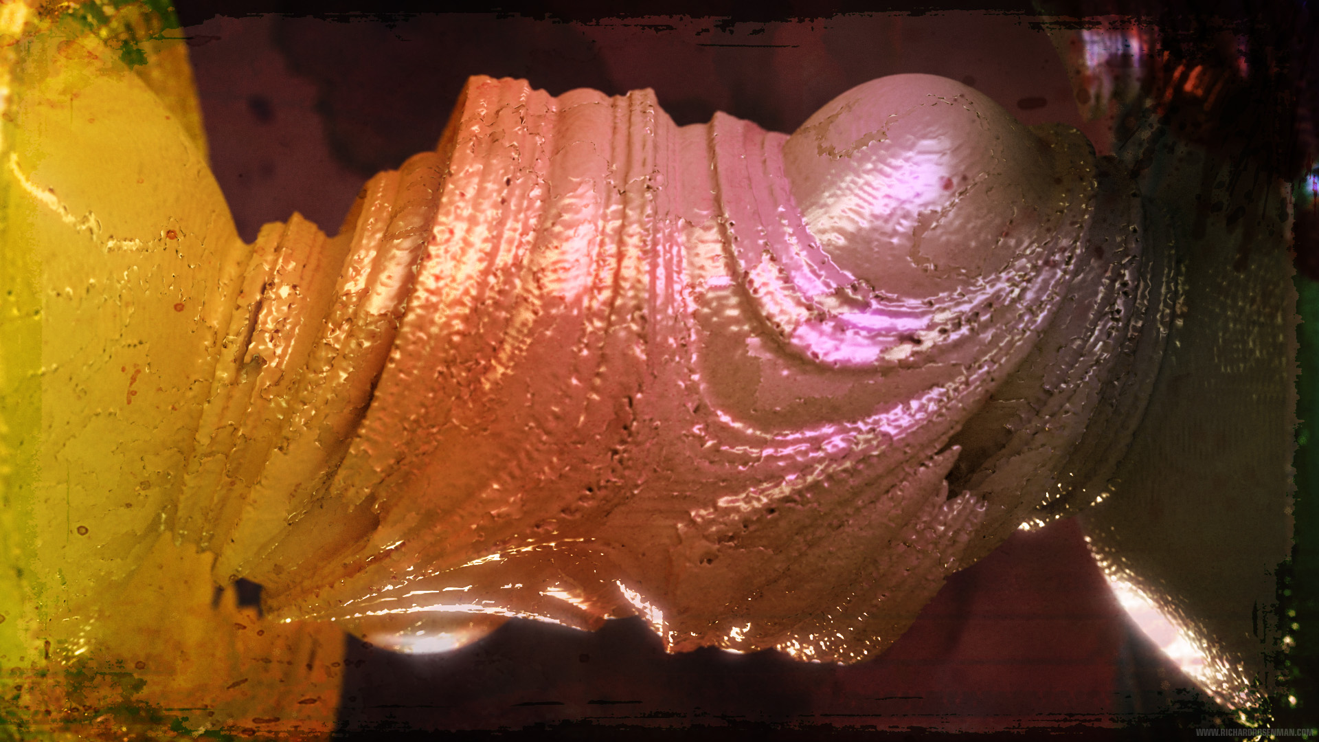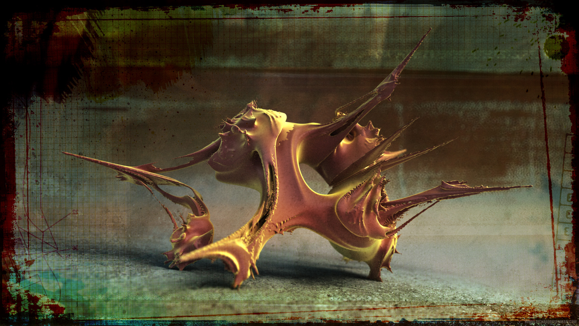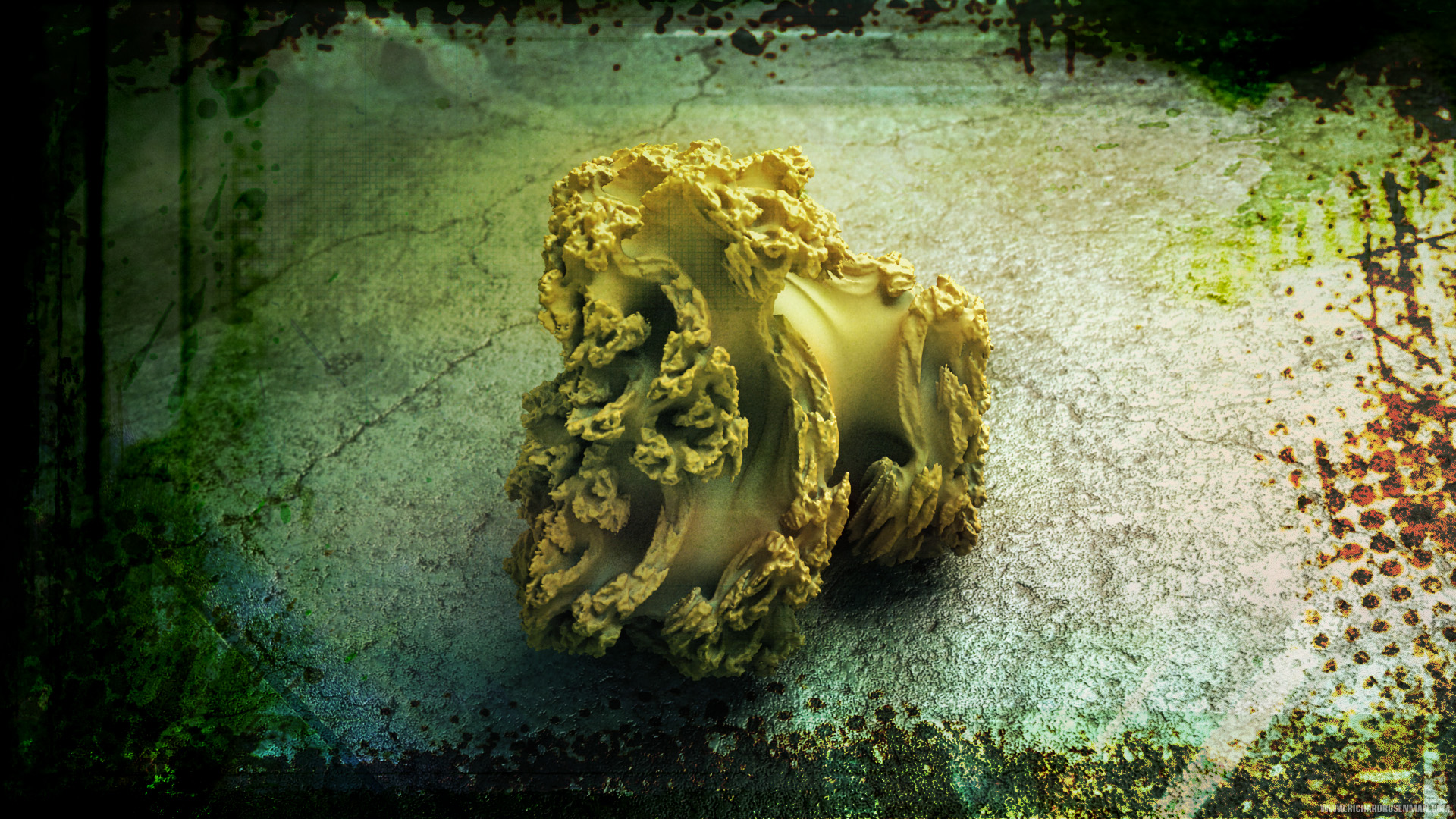 The procedure for generating and rendering 3D fractals involves a number of complex steps. First, a fractal generation application must be used to calculate the mesh object. Most of these were generated using Mystic Fractal’s QuasZ and Julia 4D. This process can take anywhere from minutes to hours, depending on the complexity of the fractal set. Once the object has been calculated, the mesh must then be exported for use in a traditional 3D rendering application. Polygon optimization methods must be applied since the generated meshes tend to be extremely dense and it is not uncommon for many of these objects to be in excess of 1-3 million polygons.