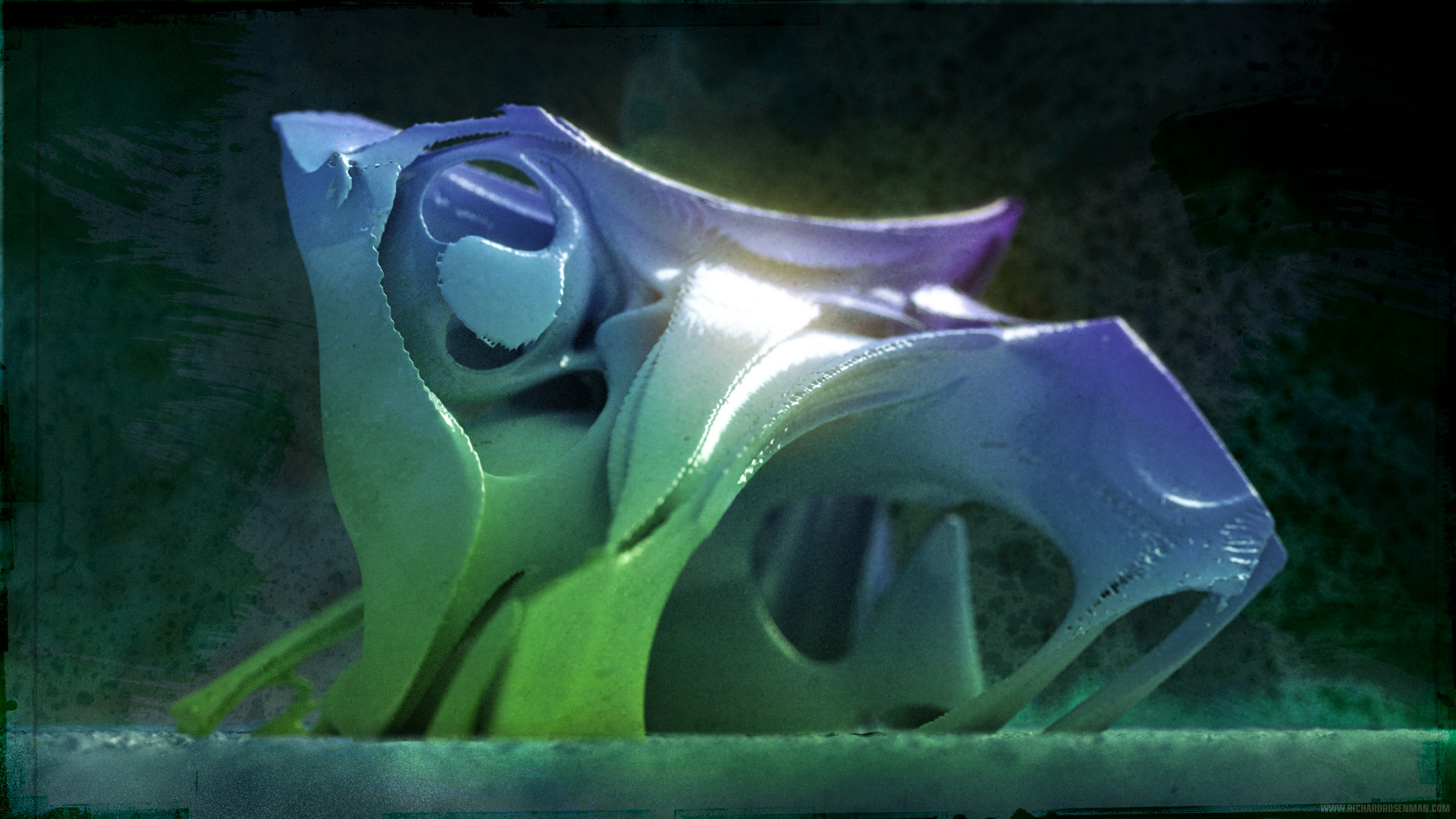 The procedure for generating and rendering 3D fractals involves a number of complex steps. First, a fractal generation application must be used to calculate the mesh object. Most of these were generated using Mystic Fractal’s QuasZ and Julia 4D. This process can take anywhere from minutes to hours, depending on the complexity of the fractal set. Once the object has been calculated, the mesh must then be exported for use in a traditional 3D rendering application. Polygon optimization methods must be applied since the generated meshes tend to be extremely dense and it is not uncommon for many of these objects to be in excess of 1-3 million polygons.