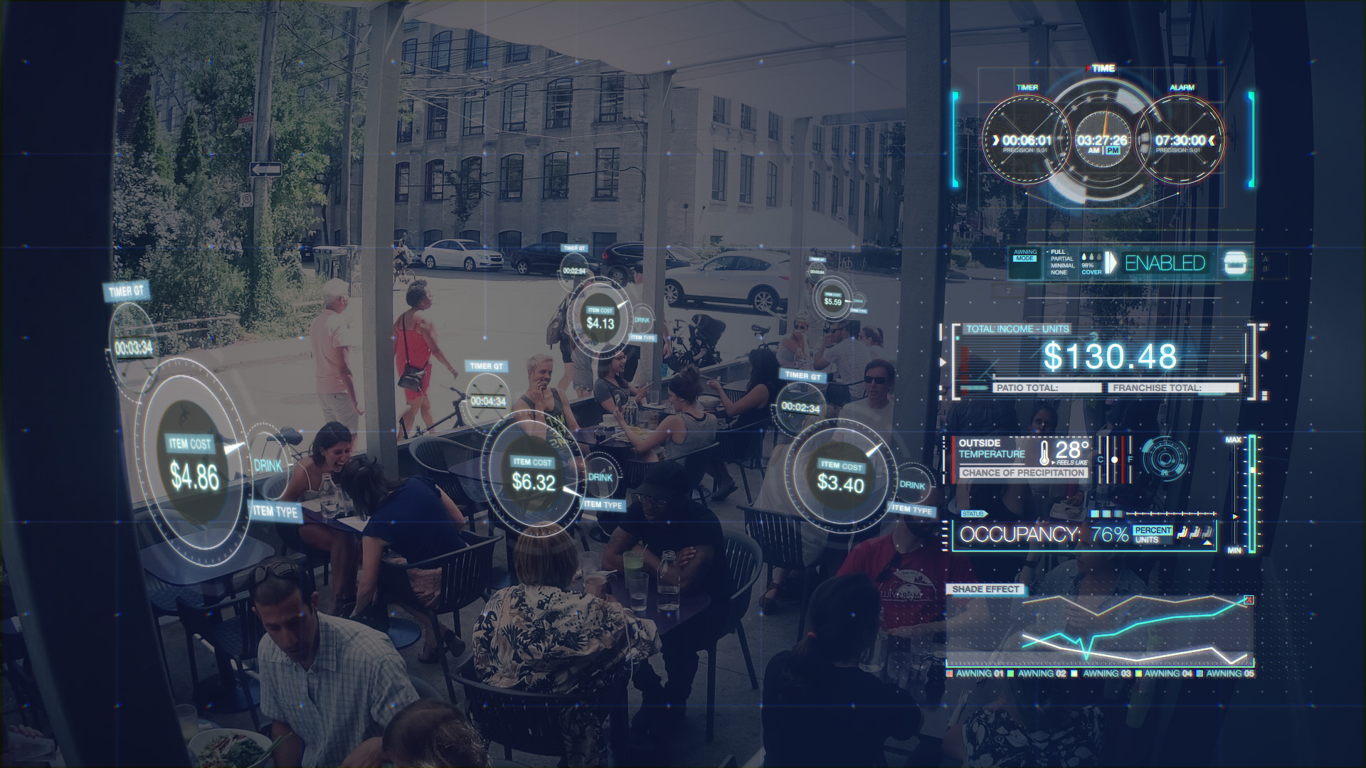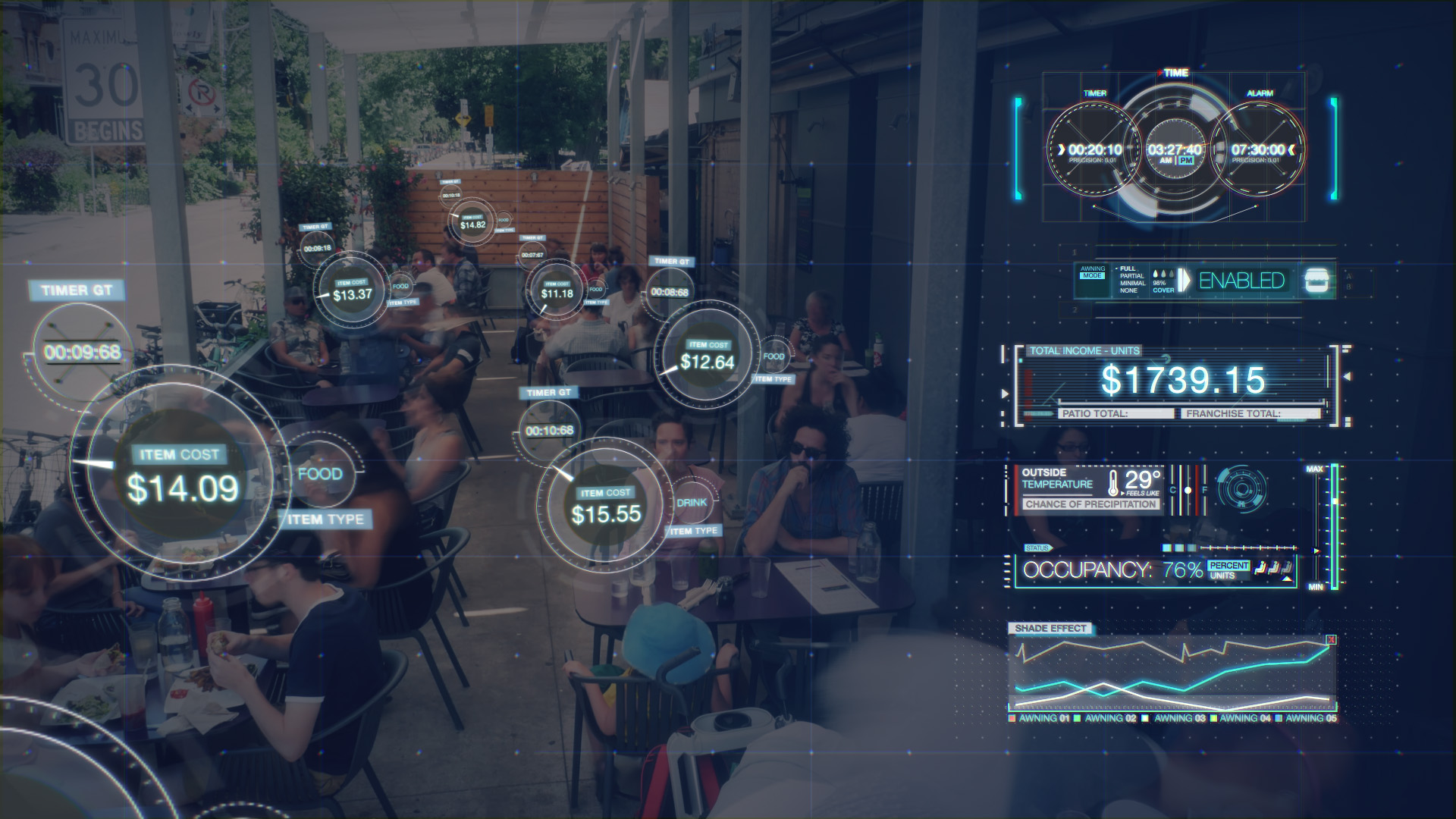 This is a video developed for PixelCarve for ShadeFX Canada, an awning deployment company for home and business. The video had to feature a high-tech feel, showcasing how much in earnings a good awning can do for a business. As the awning is deployed, HUDs appear above each patron and track their increased spending.