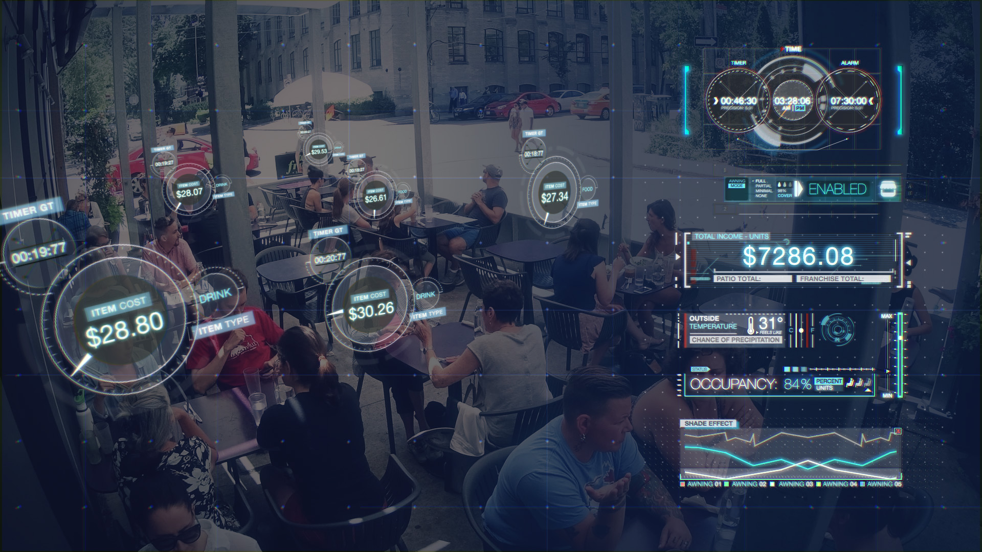 This is a video developed for PixelCarve for ShadeFX Canada, an awning deployment company for home and business. The video had to feature a high-tech feel, showcasing how much in earnings a good awning can do for a business. As the awning is deployed, HUDs appear above each patron and track their increased spending.