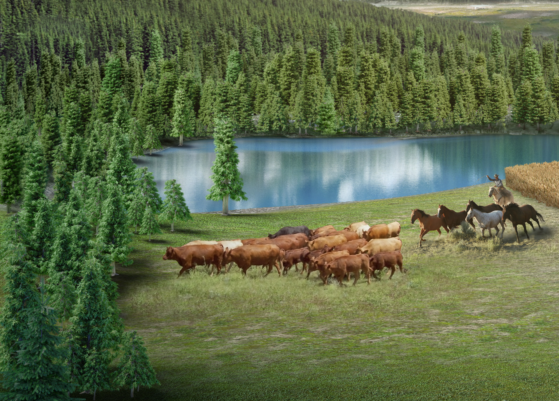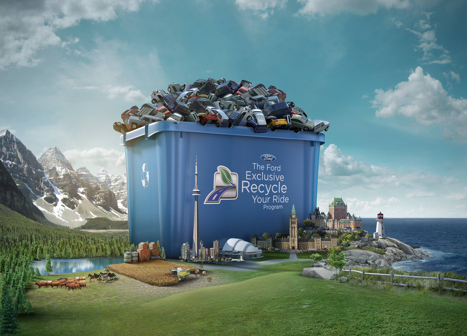 Stock photography was purchased for the various elements which were then cut out and carefully color-corrected / processed in Photoshop for proper integration into the composite. Correcting the lighting in the various images so as to match is usually the most challenging part of assembling a photo-composite but the results here turned out great. The blue bin and cars were created in 3D using various Ford model vehicles which we had used in the past for other Ford projects. The 3D lighting also had to match our 2D composite.