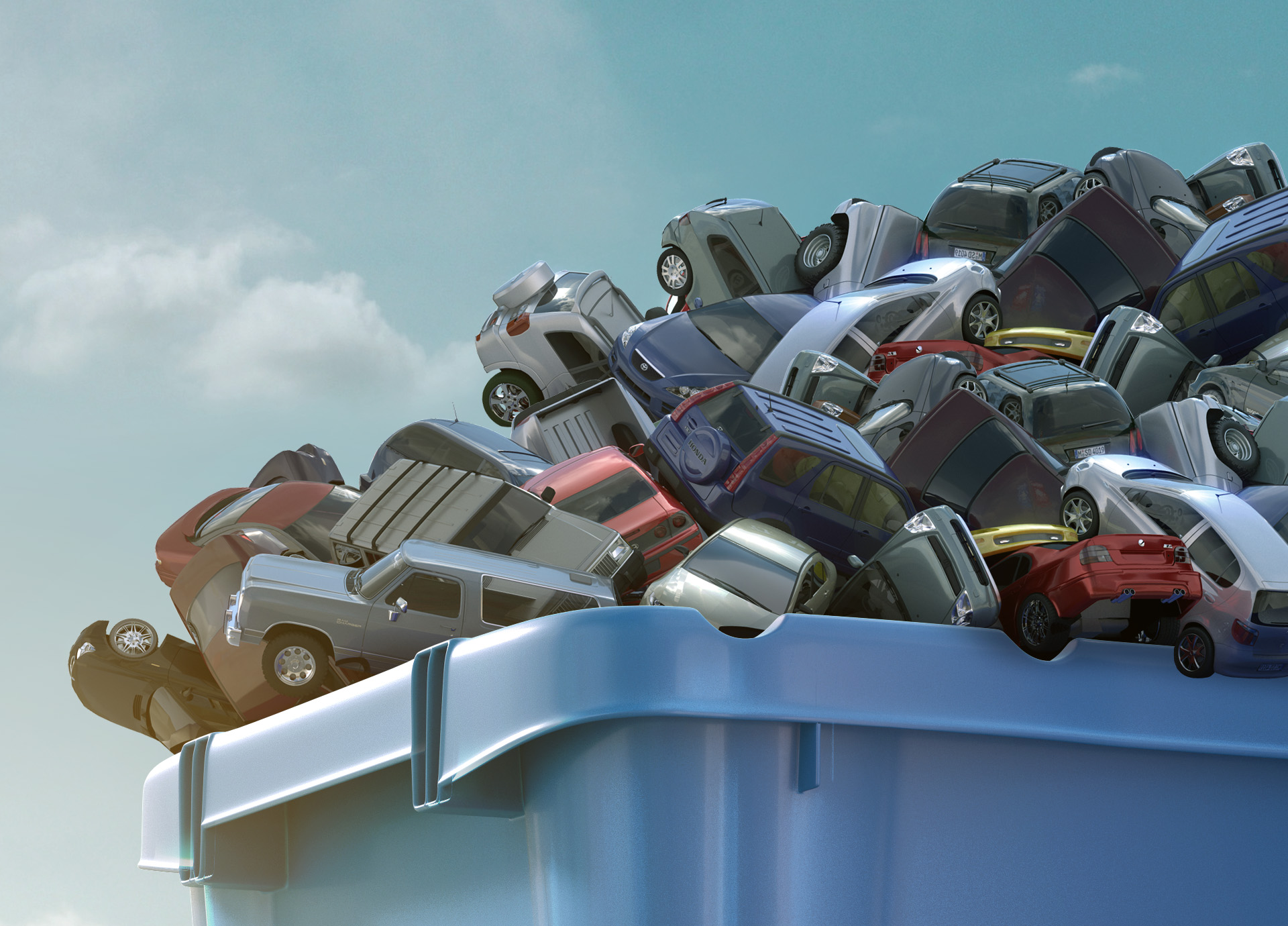 Stock photography was purchased for the various elements which were then cut out and carefully color-corrected / processed in Photoshop for proper integration into the composite. Correcting the lighting in the various images so as to match is usually the most challenging part of assembling a photo-composite but the results here turned out great. The blue bin and cars were created in 3D using various Ford model vehicles which we had used in the past for other Ford projects. The 3D lighting also had to match our 2D composite.