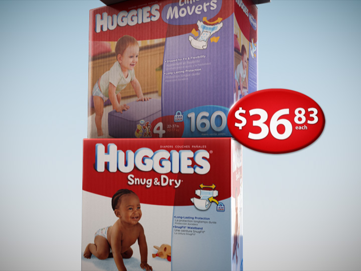 A simple but elegant spot developed for Huggies Canada, featuring a stack of diapers that collapses to reveal the product shot.