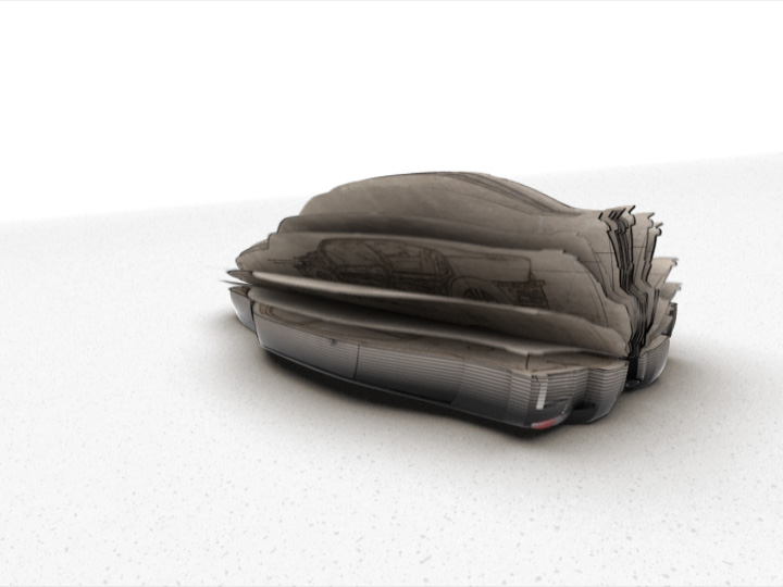 This project involved quite a bit of problem solving in order to bring Larissa’s graphic vision to life in 3D. The environment had to be continually represented in technical form, while at the same time constructing and deconstructing itself around the vehicle. Not only did geometric pillars have to grow and shrink, but so did their line-treated counterparts, all of which were rendered with the help of the FinalToon line tracer plugin.