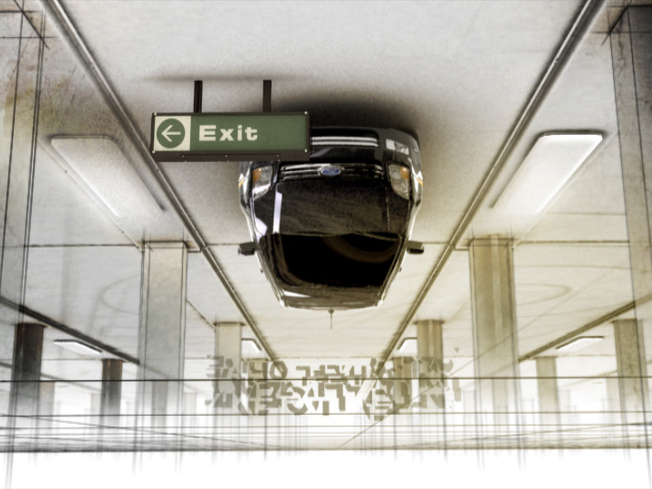 It features the Ford Fusion open like a book into a graphic and abstract garage environment in which we see the vehicle performing dynamic precision maneuvers while showcasing its various distinct abilities. At the end, the camera rotates 180 degrees revealing the Fusion parked on the garage ceiling – due to its powerful traction.