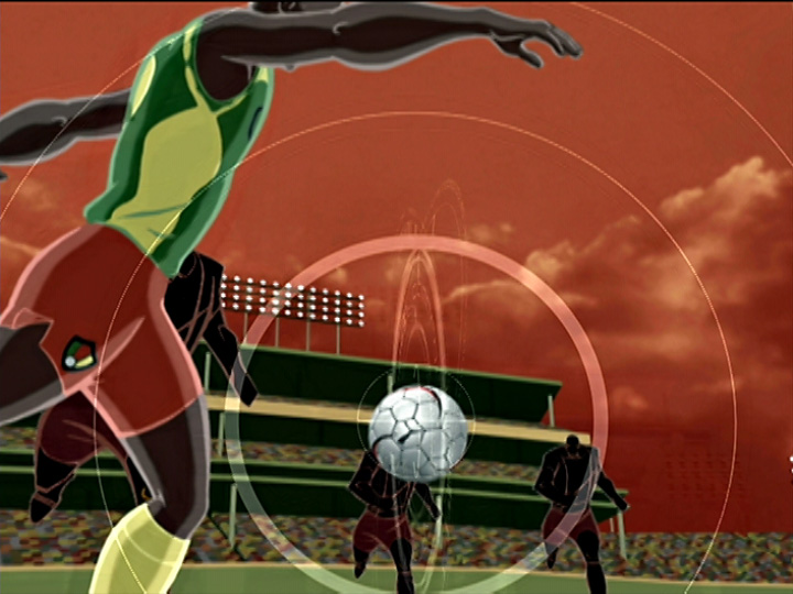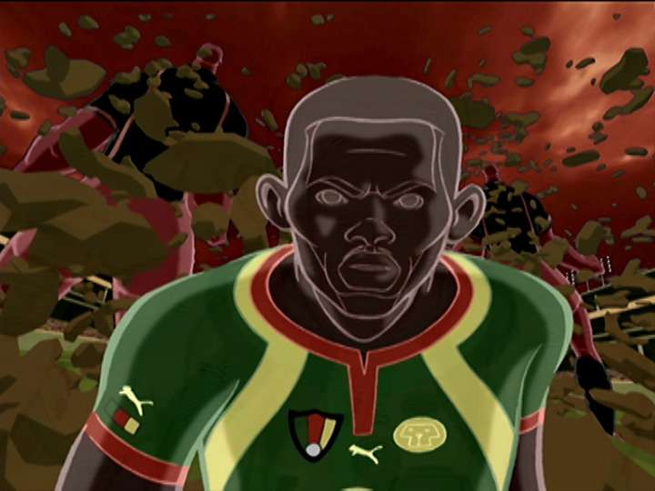 “Cameroon” was a combination of traditional animation, computer animation, and heavy graphic design, all carefully coordinated together to create a powerful and bold spot for Puma. The environment was first built in 3D, whereupon camera moves were planned out and then printed out as layouts for the traditional animators to work with. For scenes during which the background was secondary to the character’s actions, the character was first traditionally animated, and then the backgrounds were matched to him. In other instances, such as in the scene with the camera revolution around the player (image 2), secondary 3D characters were rendered in the scene for placement and perspective reference to which the traditional animators could rotoscope.