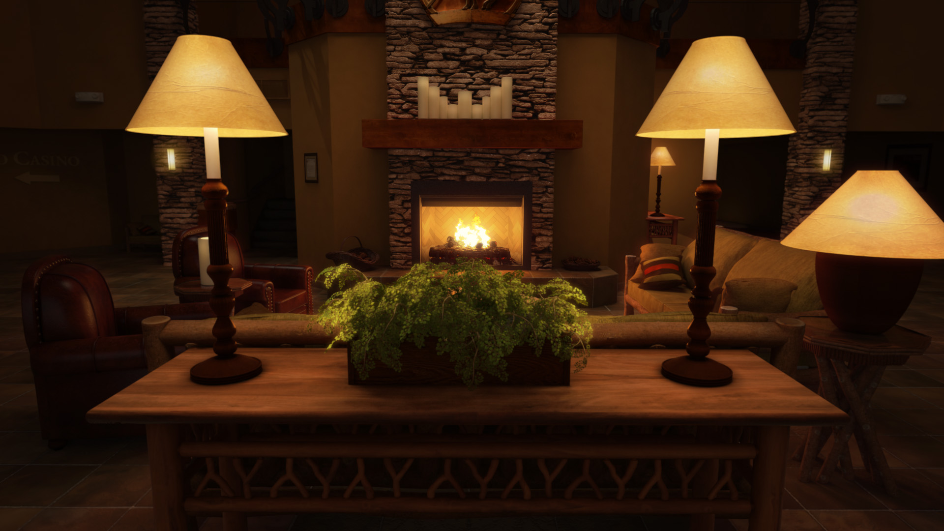 This project followed a fairly standard work-flow. I flew down to California and spent an evening photographing the interior casino lodge for layout, lighting and texture references. That evening, the photos were electronically transferred back where the modelers began constructing the room virtually. Textures were extrapolated from the high resolution photographs, perspective-corrected and applied to matching objects. The lighting was reproduced based on image samples and animation created based on the layout and book placement.