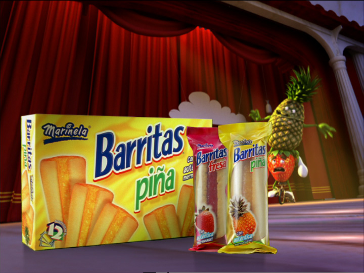 Barritas “Casting” consisted of a twenty-second spot for the Marinela company in Mexico. The spot was heavily focused on character work and required three fully modeled, rigged and textured characters – a pineapple, a strawberry, and a pastry bun. We had approximately two and a half months scheduled time to produce two spots from start to finish. About three weeks were assigned to modeling, four weeks for animation, two weeks for lighting and rendering, and the remaining week for compositing. These jobs turned out to be quite fun to work on since we were able to push the character performances as far as we wanted to which resulted in some very funny animation.