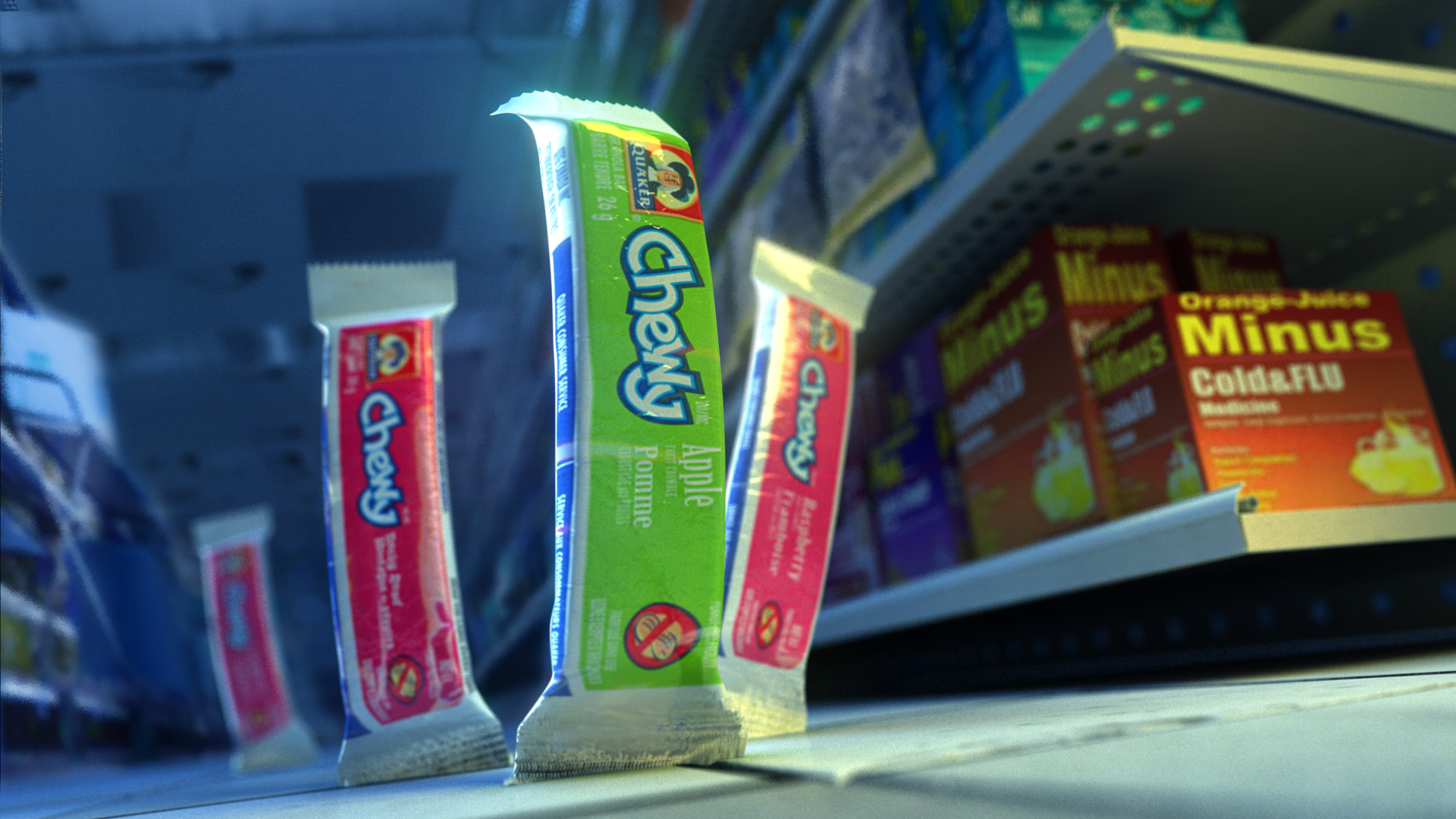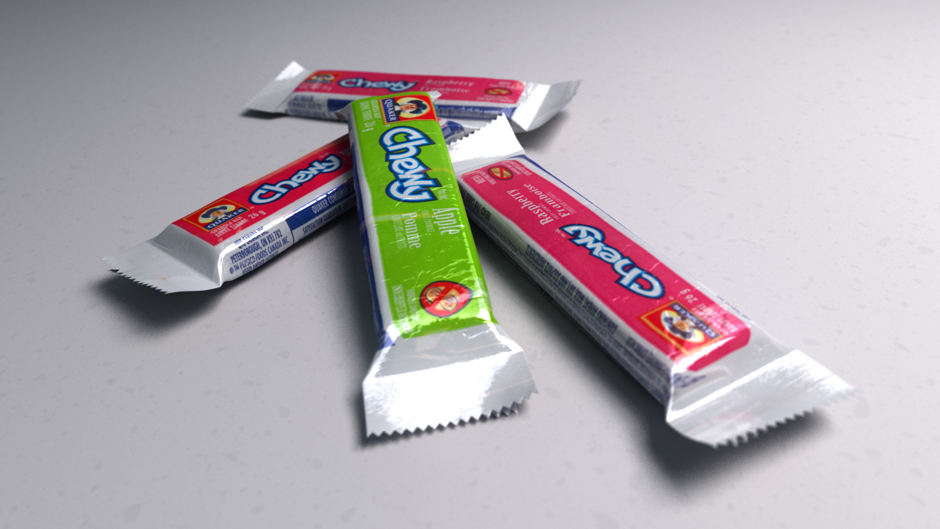 Quaker Chewie Granola Bars modeled in 3D for a production demo. A store interior was developed for the setting.