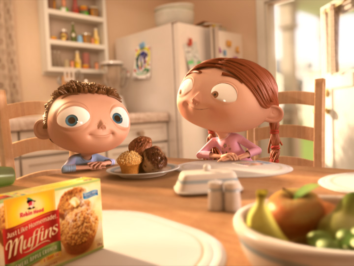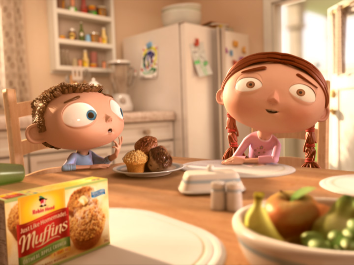 The spot reveals two children named Andrew and Elizabeth explaining how they’ve just won the county fair muffin contest with Robin Hood “Just Like Homemade Muffins”. The prize they brought home pops in at the end for a surprise finale. The sunny afternoon setting fills the kitchen with a warm inviting sunlight and creates a visually engaging commercial that arouses immediate interest in the viewer.