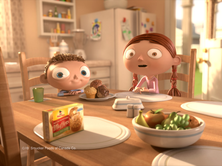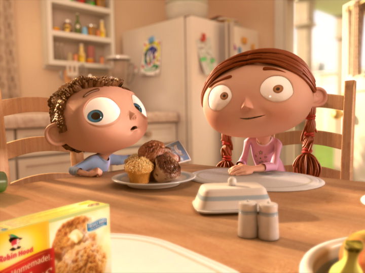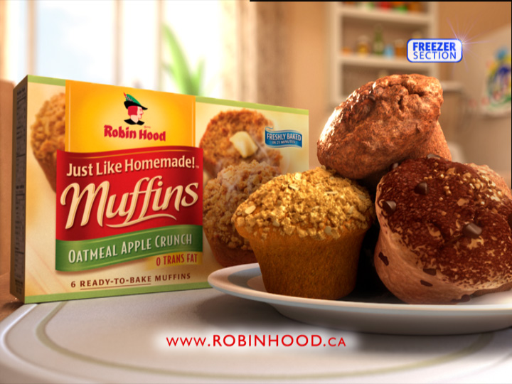 The spot reveals two children named Andrew and Elizabeth explaining how they’ve just won the county fair muffin contest with Robin Hood “Just Like Homemade Muffins”. The prize they brought home pops in at the end for a surprise finale. The sunny afternoon setting fills the kitchen with a warm inviting sunlight and creates a visually engaging commercial that arouses immediate interest in the viewer.