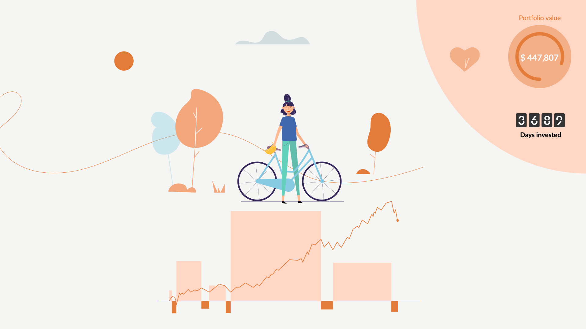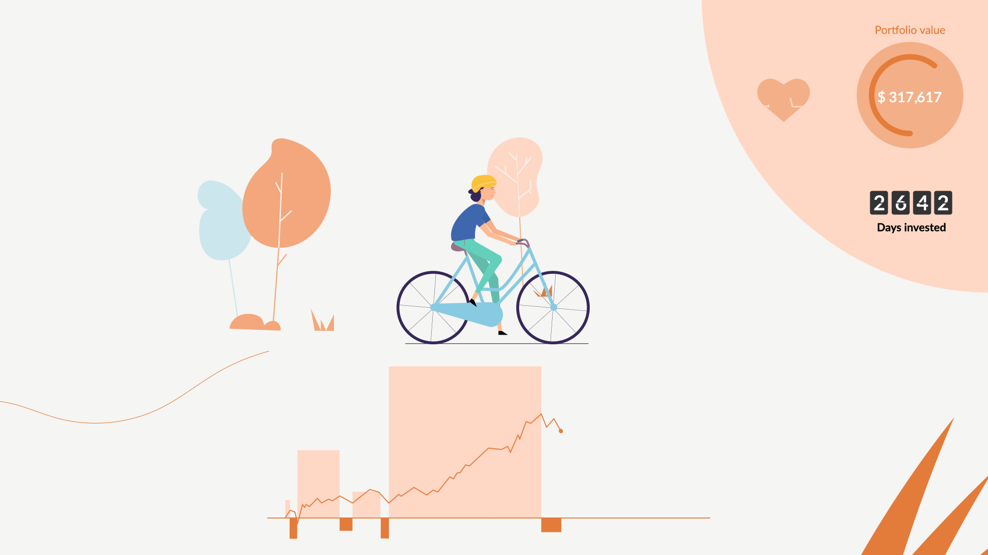 I spent time developing our hero character named Mimi who’s ongoing bike ride is a metaphor of ‘riding the market’ through both calm and tumultuous times. The result is a beautifully-animated character piece both informational and creatively engaging.