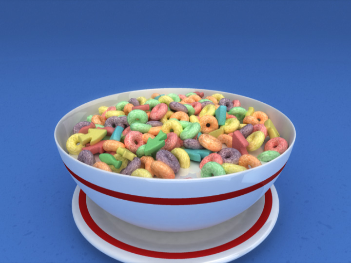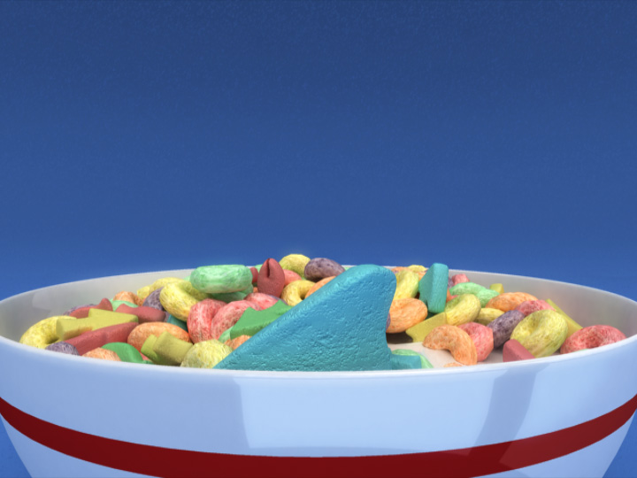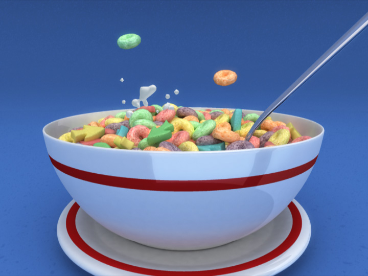 This spot was a 10 second tag, just recently completed for Leo Burnett, featuring a new variation of the Froot Loops family of cereals. Textures were scanned off the original food product, as usual, in order to retain the physical characteristics as much as possible. Bump, specularity and opacity maps were derived off the scans as well. The milk splashes were created with a simple metaball particle system and then composited over the rendered footage during post, along with some additional processing. Final frame renders with VRay proved to be of outstanding quality while remaining under the 30 minute per frame time restriction.