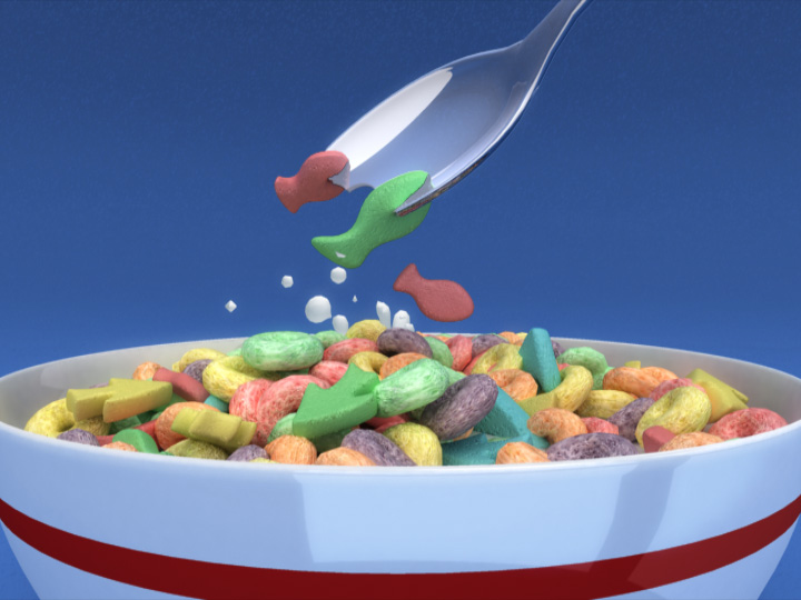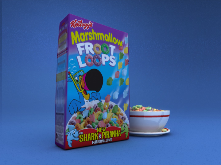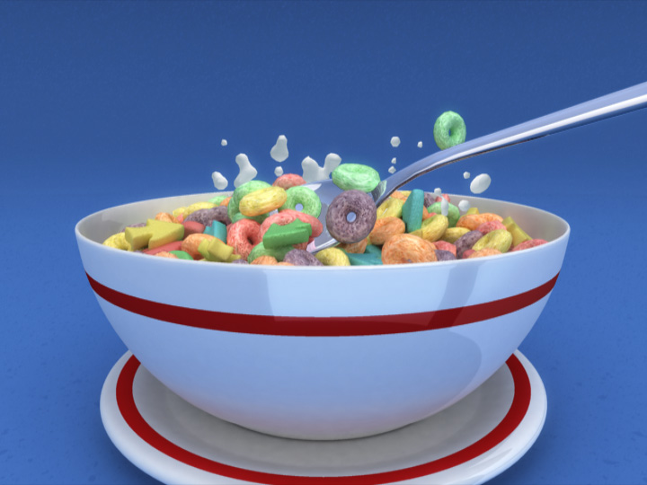 This spot was a 10 second tag, just recently completed for Leo Burnett, featuring a new variation of the Froot Loops family of cereals. Textures were scanned off the original food product, as usual, in order to retain the physical characteristics as much as possible. Bump, specularity and opacity maps were derived off the scans as well. The milk splashes were created with a simple metaball particle system and then composited over the rendered footage during post, along with some additional processing. Final frame renders with VRay proved to be of outstanding quality while remaining under the 30 minute per frame time restriction.