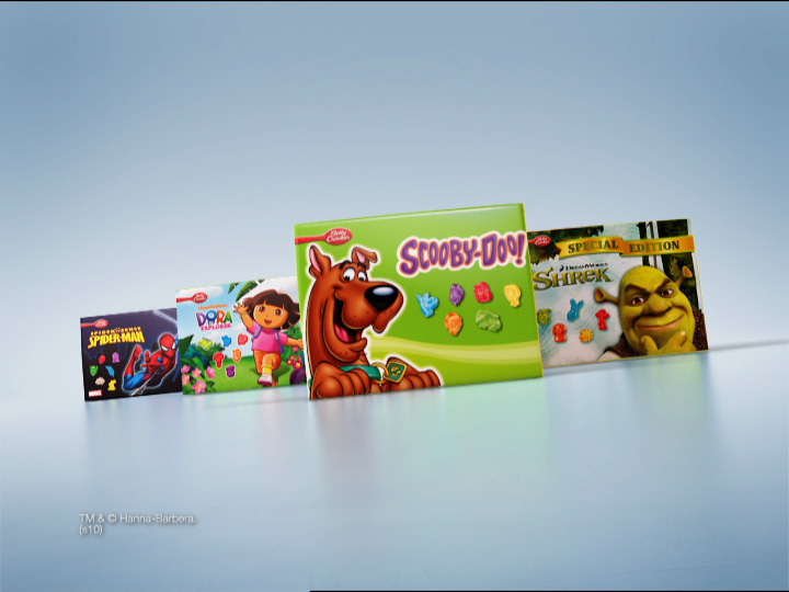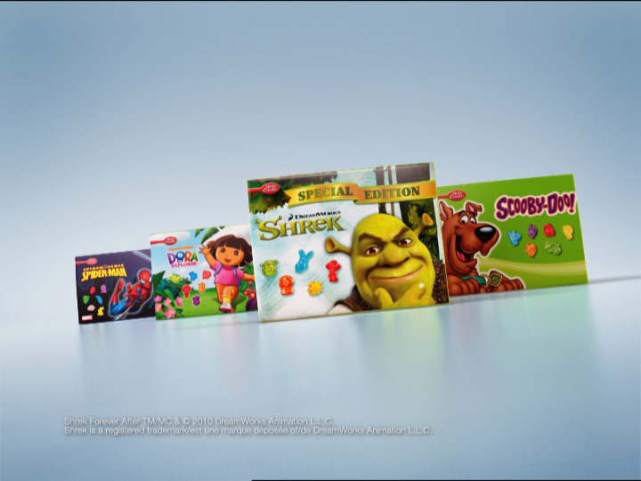 These :10 tags were produced for Betty Crocker Canada featuring Shrek, Scooby Doo, Dora and Spiderman Fruit Snack gummies.