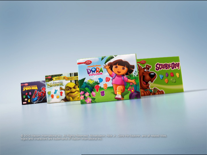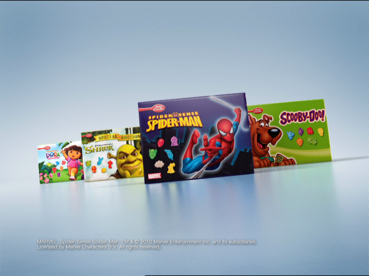 These :10 tags were produced for Betty Crocker Canada featuring Shrek, Scooby Doo, Dora and Spiderman Fruit Snack gummies.