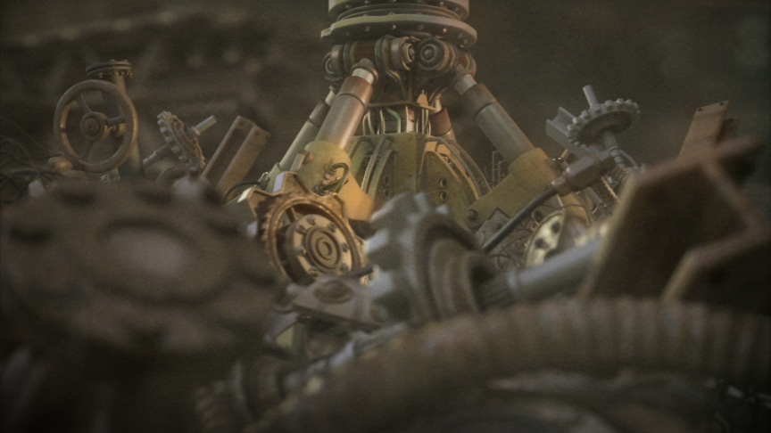 In this cinematic, I also played with the state of various environments in order to create an increasing contrast between grungy and clinical settings. This becomes evident as we start on a grimy scrap yard and end up in a spotless, laboratory room. The final environmental change is defined by the electrical current fired into the sphere.