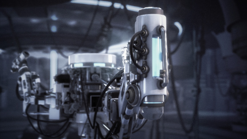 In this cinematic, I also played with the state of various environments in order to create an increasing contrast between grungy and clinical settings. This becomes evident as we start on a grimy scrap yard and end up in a spotless, laboratory room. The final environmental change is defined by the electrical current fired into the sphere.