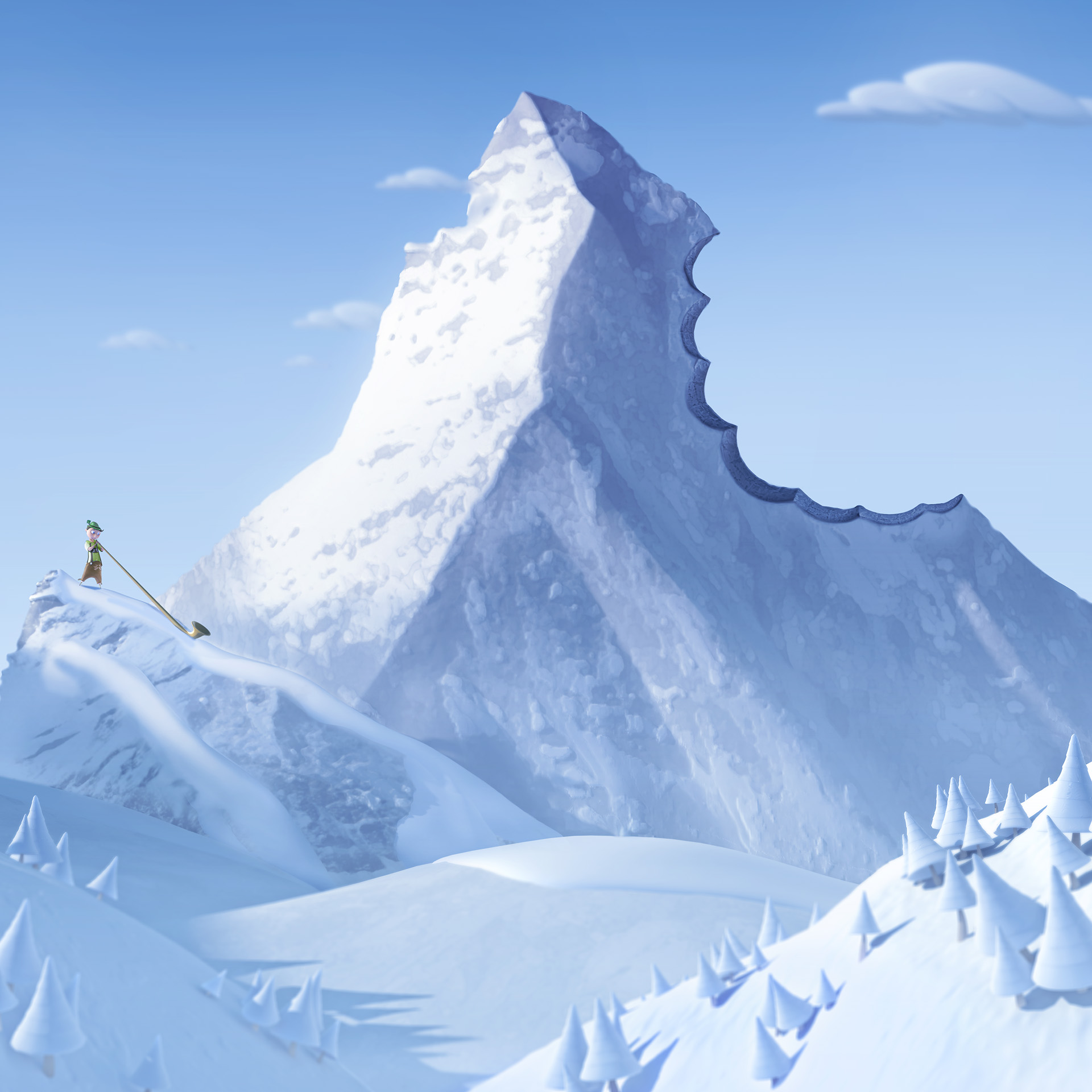 Toblerone “Matterhorn Print” is a magazine print created to accompany the other Toblerone prints (see similar projects). Like the heavily stylized spot, this print features a stylized Matterhorn mountain with an equally stylized character. Like the other prints, the Matterhorn appears to have the Toblerone bite taken out of it.