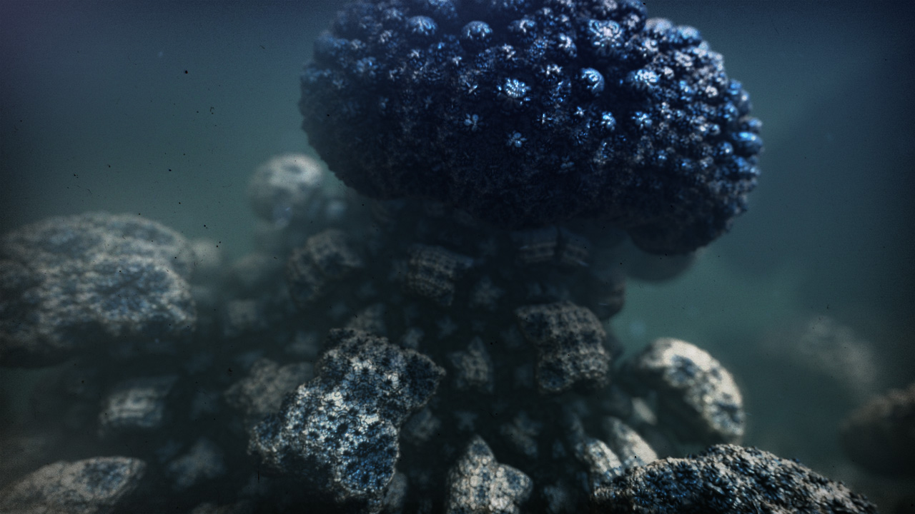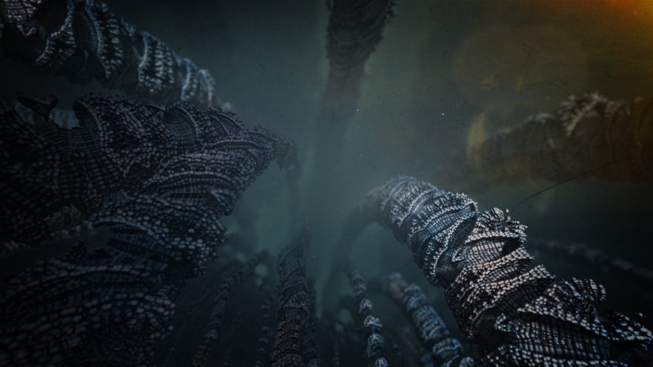 Because the animation of these fractals suggests a similarity to sea creatures & plant life, the compositing was treated as such thereby creating dark and mysterious underwater abstract shots.