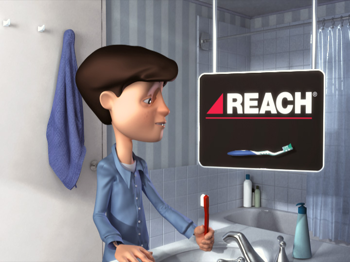 This is one of two spots produced for Reach. Appropriately named “Mouth Moves”, it features a character being able to brush his teeth by sliding his mouth around his face.