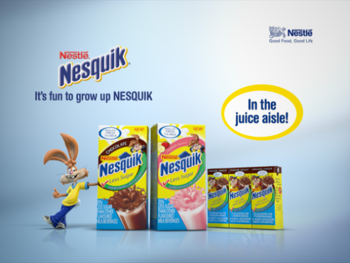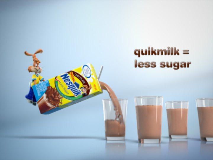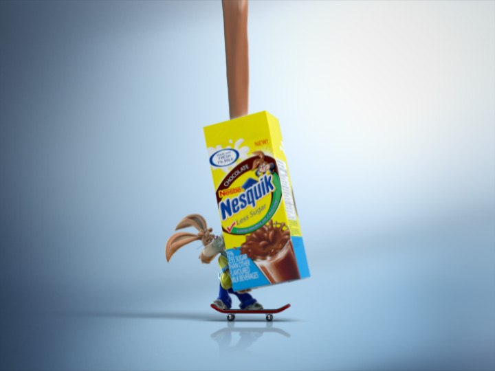 This was a short tag created for Nestle Canada featuring the Nesquik bunny for the first time in 3D. Because we wanted to ensure consistency with the historical 2D version, we rendered the character using a hybrid 2D / 3D shader, complete with accentuated outlines. Fur was avoided in order to maintain a clean and concise appearance. His familiar and ecstatic ear twist was added in order to carry through his historically-established personality.