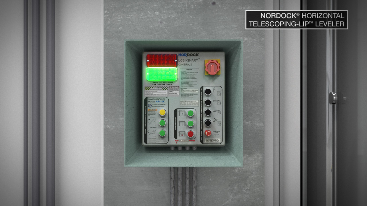The horizontal telescoping lip leveler was a CAD model that was provided by Nordock. The warehouse was also custom built and modified from the Nordock NVTL video to accommodate the NHTL machinery, while other less significant models were purchased and then adapted. Shots were set up from a storyboard which was then developed into an animatic. From there, shots were revised daily until animation was polished and finalized. The rendering for this project took approximately 10 days. Motion graphics were applied in post.