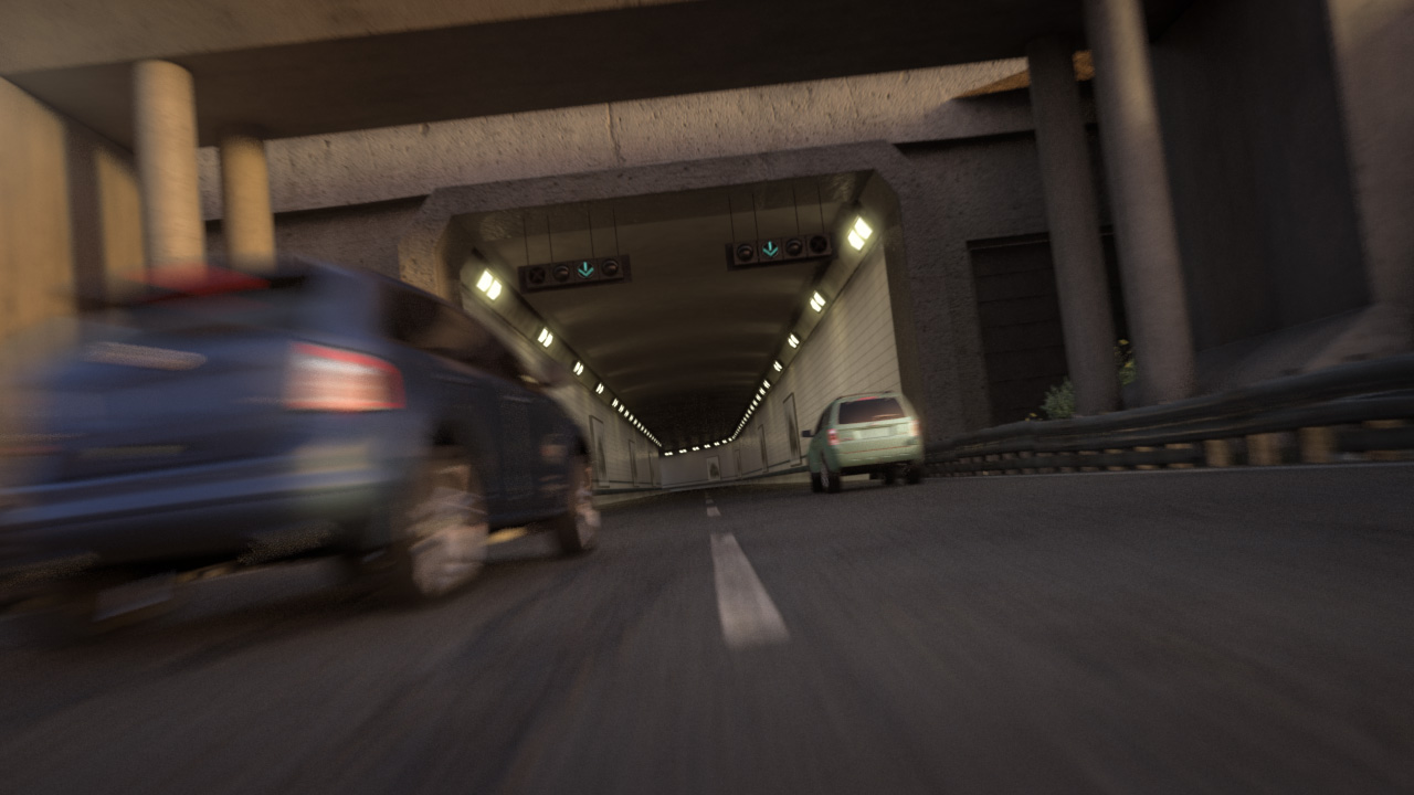 The tunnel environment proved to be especially challenging to render due to interior global illumination lighting limitations. In most cases, the work-around was to bake in the GI lighting onto the textures so as to avoid further GI rendering.