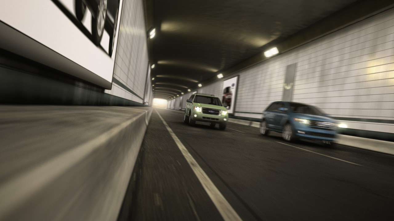 The tunnel environment proved to be especially challenging to render due to interior global illumination lighting limitations. In most cases, the work-around was to bake in the GI lighting onto the textures so as to avoid further GI rendering.