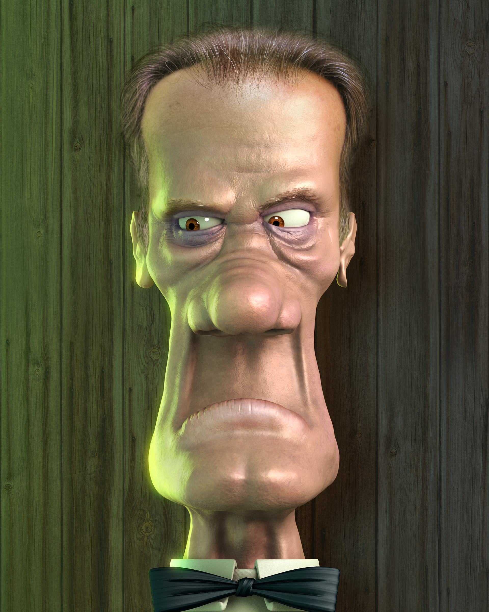Ronald was created over the span of about a month, on and off. He was the first of my characters created with ZBrush. The base model was created within 3dsmax, then imported into ZBrush where it was sculpted, textured and displaced. Thereafter, he was exported back into 3dsmax for lighting and rendering using VRay 1.45.70. The rendering was split up into numerous layers such as diffuse, specular, shadow, ambient occlusion, diffuse glows, etc, for optimum control during the compositing stage. The hair was created from a composite photograph and distorted to match Ronald’s head proportions.