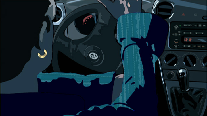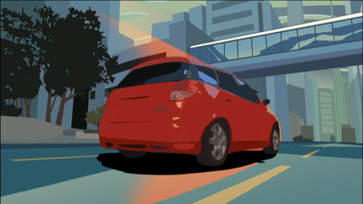 Toyota Matrix “Shift Reality” was a spot just recently completed in under 1 month for both cinema and television broadcast. The concept was to show an animated commercial in which Toyota’s new car accelerates to such high speeds that the air resistance ‘peels’ off the animation thus revealing the live-action vehicle underneath. We then follow with several beauty shots of the car driving throughout different environments until it reaches a stop by pulling a dramatic skid into a parking lot. The driver gets out, and the animation catches back up to the car wrapping itself around both the car and its environment.
