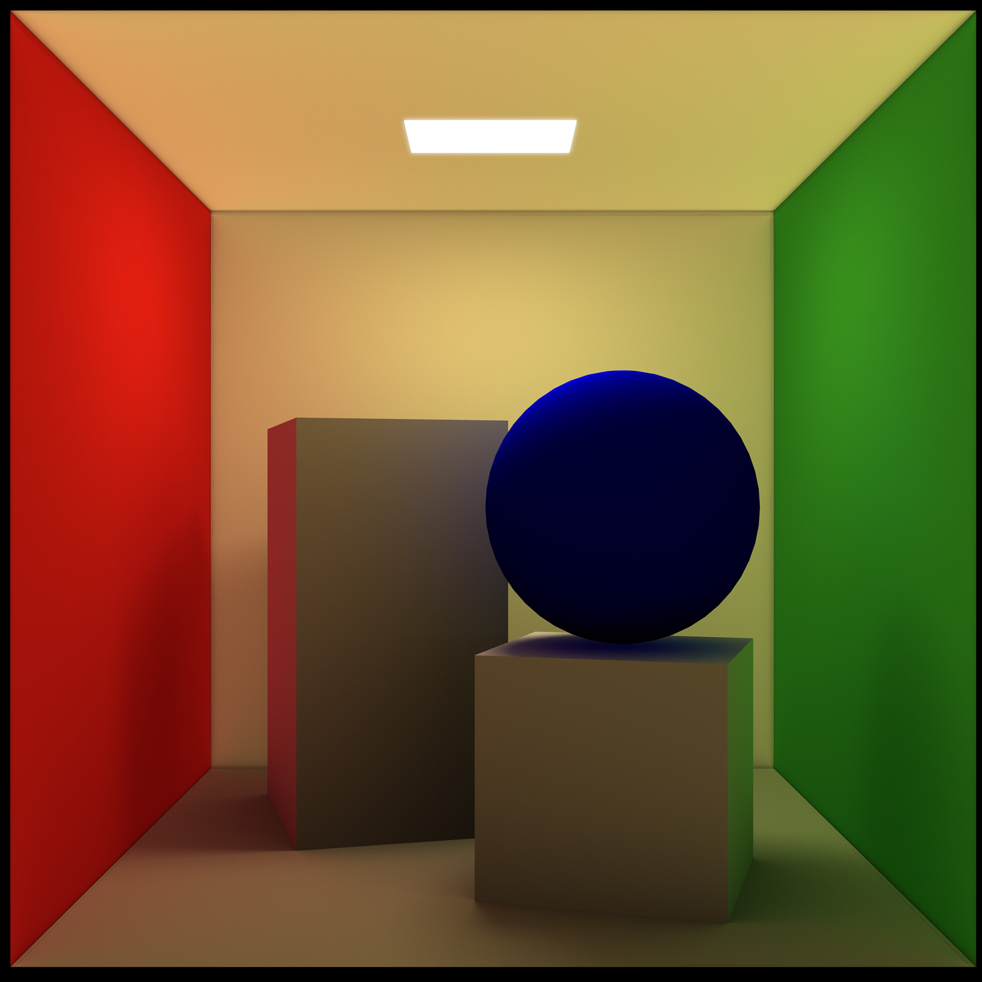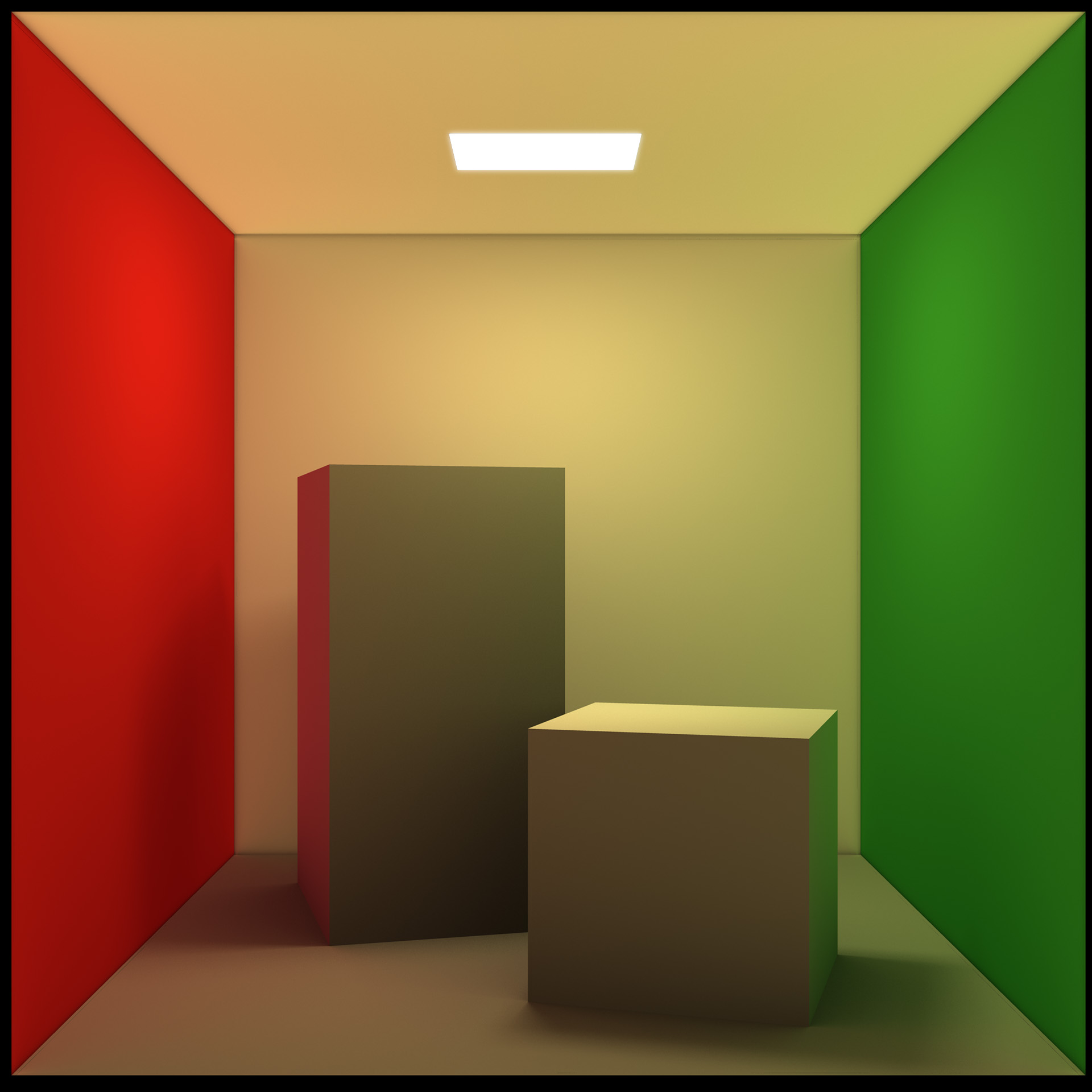 The concept of simulating radiance is rather simple, although it can become quite complicated depending on the complexity of the scene. The idea is place various lights at distinct object locations, colored similarly to the object’s diffuse color. A falloff must be specified in order for the light to respect distancing and the intensity should be kept to a minimum in order to avoid the illusion of self-illuminated objects. In the examples below, for instance, coloured lights have been placed at each wall matching the diffuse color.