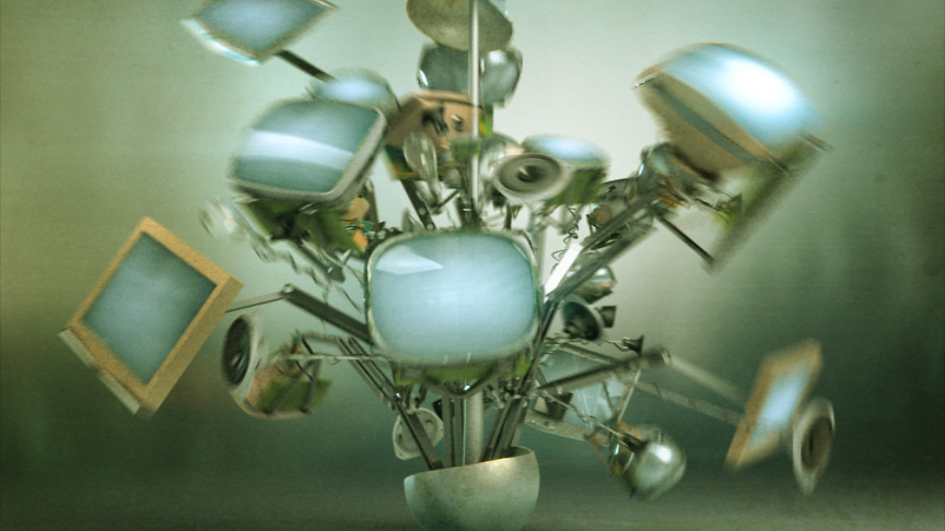 The screens were mapped with a cyan-colored image that was later replaced with live-action footage having been tracked using Max2AE. Camera and tracking information was exported from 3dsmax and imported into After Effects where the screen mapping was applied to animated planes. Additional passes such as reflections were then applied on top of the footage for added realism. The movie seen here is without the mapped footage.