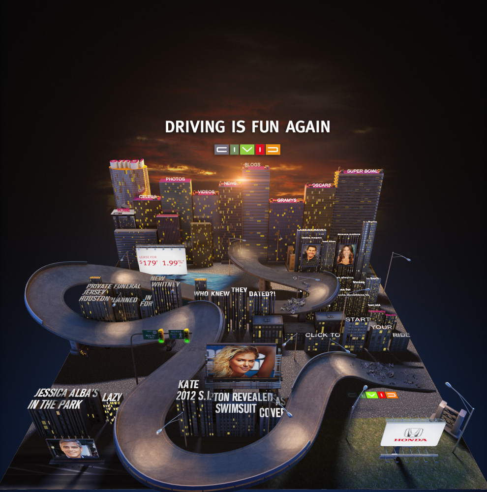 A fun 3D website takeover spot created for Honda, featured on the Yahoo site.