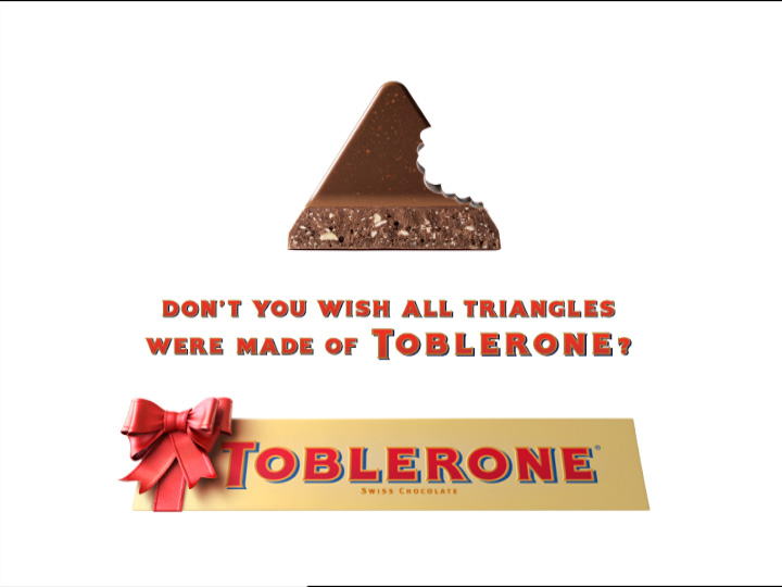 Toblerone “Christmas” is an elegant :15 tag featuring four stylized characters in an equally stylized Toblerone world where various objects throughout the environment appear to have the Toblerone bite taken out of it.